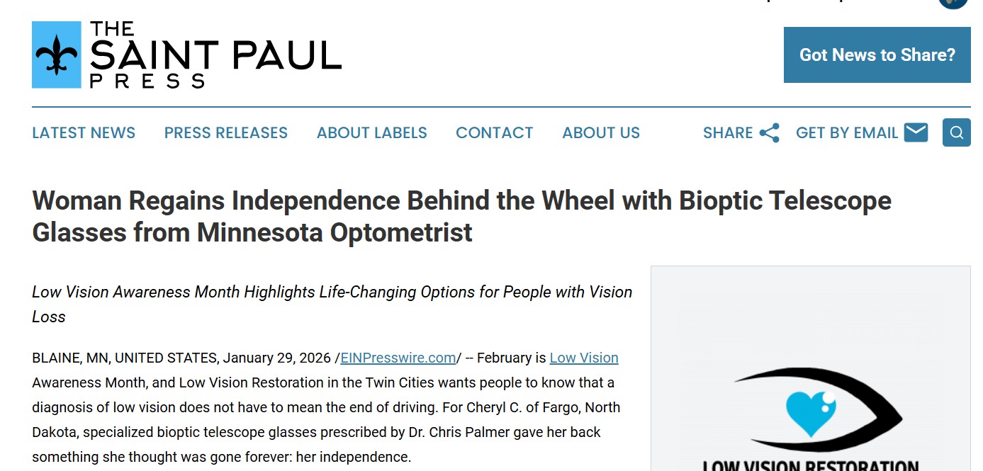 In The News Woman Regains Independence Behind the Wheel with Bioptic Telescope Glasses from Minnesota Optometrist June 2025 | Vision Restored: Dr. Chris Palmer and Patient Ken Nelson Inspire Viewers on “Twin Cities Live” with Breakthrough Eyewear February 2024 | Little-Known Devices Restore Vision to People Who Can’t Be Helped by Regular Glasses February 2023 | Bringing Light to Low Vision: Dr. Chris Palmer’s Vision Restoration Efforts March 2022 | Dr. Palmer Talks Low Vision on the Sheletta Show January 2022 | Dr. Chris Palmer, a Low Vision Specialist, Has Become a Ray of Hope for People Suffering From Macular Degeneration 2021 | Television Commercial February 2021 | Low Vision Awareness Month: MN Doctor at Low Vision Restoration Focuses on Solutions, Not Treatments January 2020 | Dr. Chris Palmer, Low Vision Optometrist, Low Vision Restoration, LLC, Helps Patients Across Midwest Restore Eyesight To Improve Lives 2019 | Television Commercial January 2018 | Advancements from International Academy of Low Vision Specialists Offer New Hope to Macular Degeneration Patients February 2017 | WCCO Interview February 2017 | KARE 11 Interview 2017 | Television Commercial