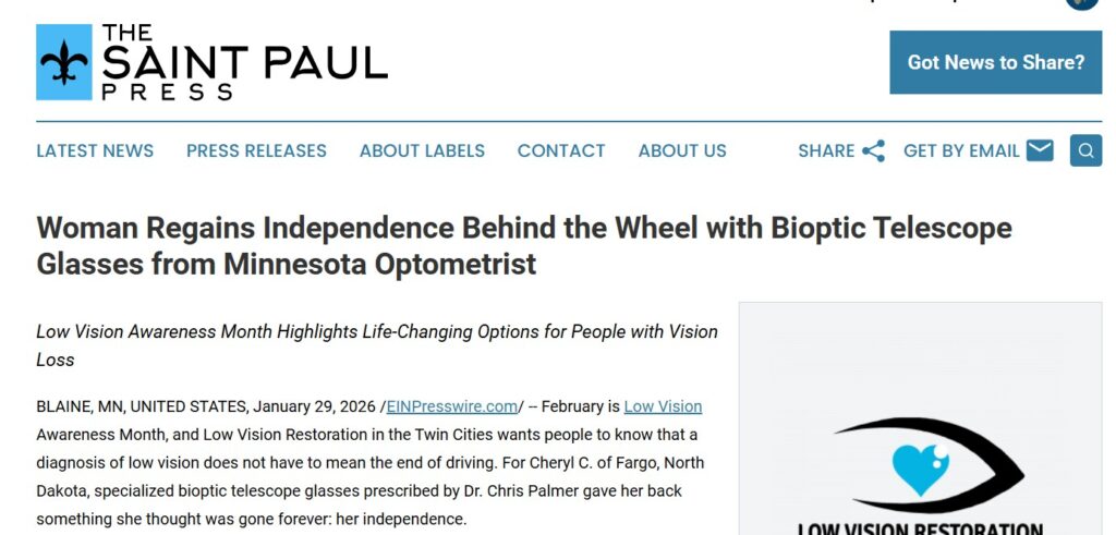 BLAINE, MN, UNITED STATES – January 29, 2026 /EINPresswire.com/ — February is Low Vision Awareness Month, and Low Vision Restoration in the Twin Cities wants people to know that a diagnosis of low vision does not have to mean the end of driving. For Cheryl C. of Fargo, North Dakota, specialized bioptic telescope glasses prescribed by Dr. Chris Palmer gave her back something she thought was gone forever: her independence.